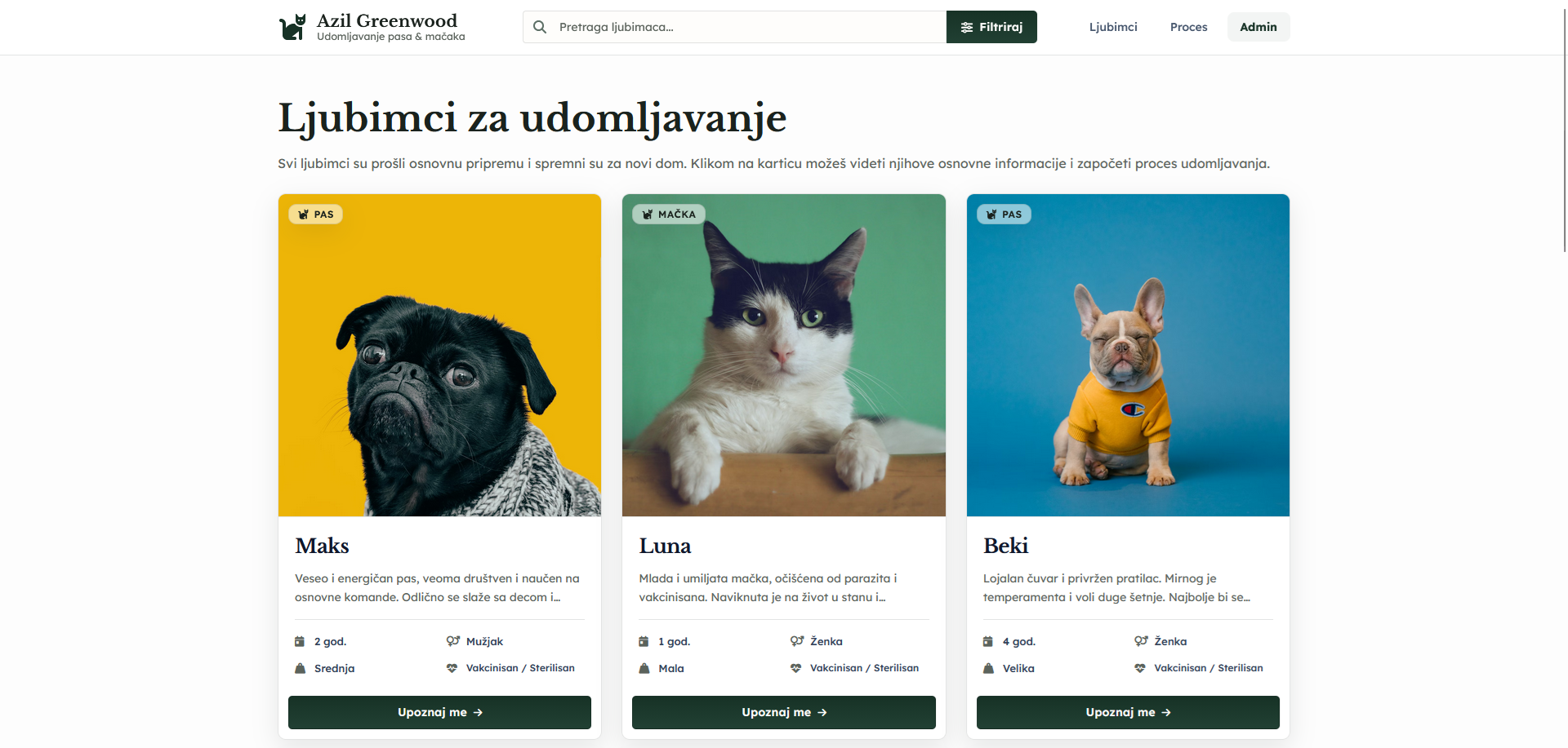 Digitalno rešenje za povezivanje ljubimaca sa njihovim novim domovima. Aplikacija je dizajnirana da bude brza, jednostavna za korišćenje i vizuelno privlačna, fokusirajući se na ono što je najbitnije — životinje.