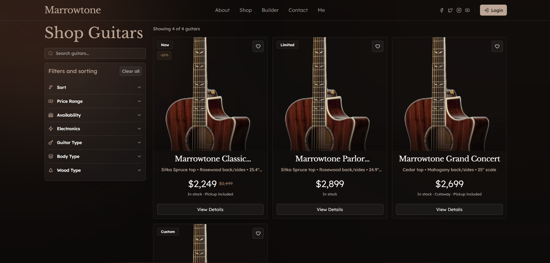 - Advanced Filtering: Filter by body shape, wood type, electronics, price range, and in-stock status